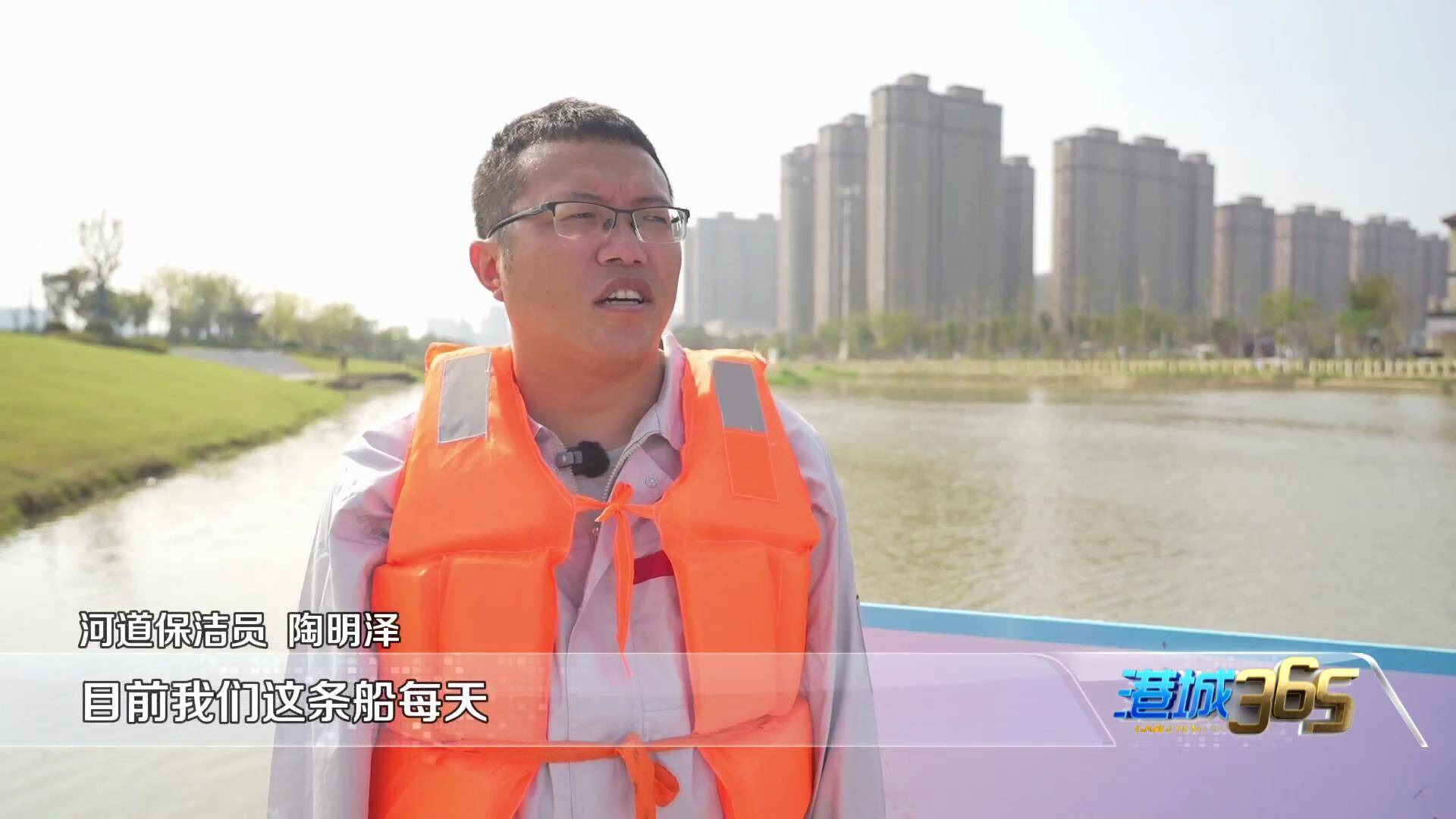 上午,在东盐河河面上,河道保洁员陶明泽和同事驾驶着保洁船缓缓行进,仔细清理着河面的漂浮物与岸边的零星垃圾。